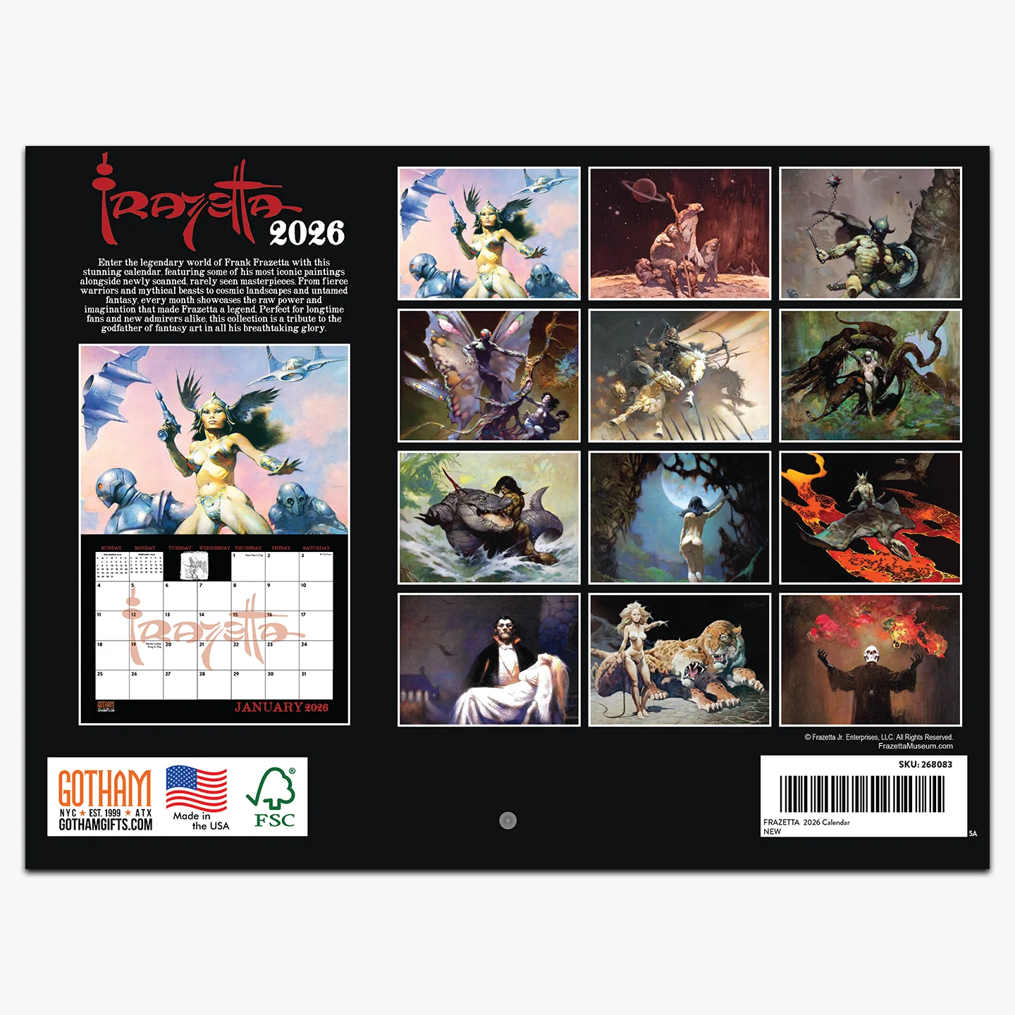 Step into a year of legendary fantasy with the official 2026 Frazetta Wall Calendar. Featuring twelve of Frank Frazetta’s most iconic paintings- one for each month- this calendar brings raw power, mysticism, and motion to your walls. From fearsome warriors and seductive sorceresses to beasts born of imagination, each piece captures the essence of Frazetta’s groundbreaking art.