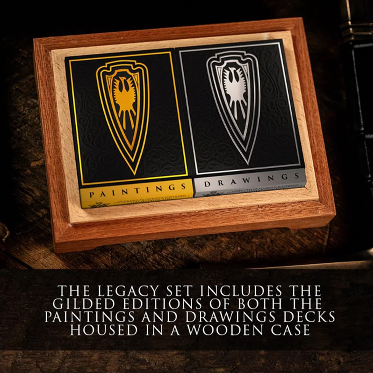 Experience the iconic art of Frank Frazetta with the Frazetta Playing Card Deck: Legacy Set. This limited edition set includes both Gilded Edition Decks in a custom-made legacy box, featuring a top lid for secure storage and the classic Frazetta logo inlaid on the wood. Embrace the legacy of Frazetta with this collector's item.