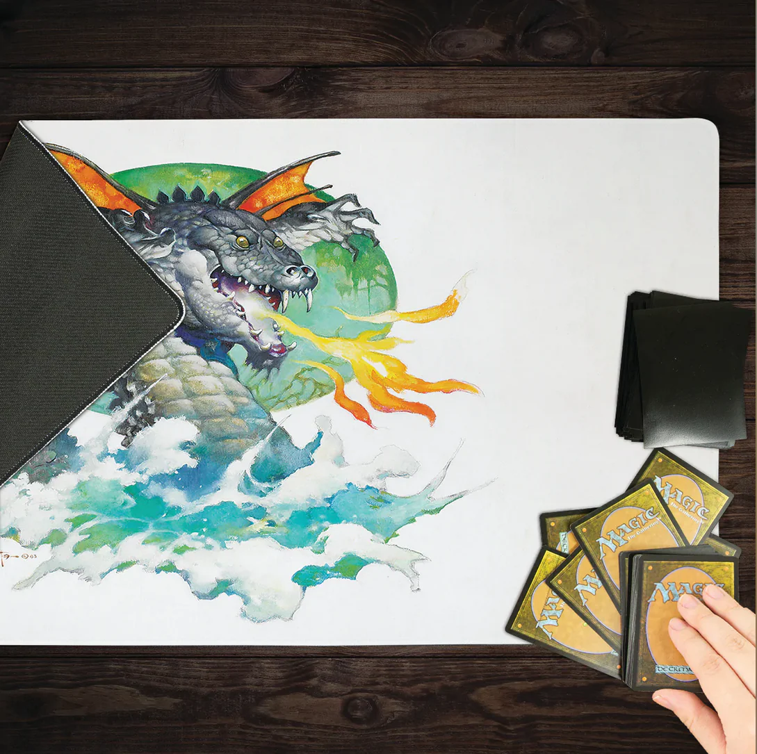Looking for a mat to give your game a breath of fresh fire? You’ve found it in Frank Frazetta’s Winged Crocodile Dragon design. Carefully crafted in-house with premium materials both on the top and bottom, this playmat is key to enhancing the way you play. The smooth polyester on the top enables better card handling and management, which leads to smoother moves and pick-ups. That means no more sliding your cards off the table just to flip them over. On the bottom, you’ll find a strong anti-slip rubber that grips tightly on every surface and keeps your mat from sliding around on surfaces during games. By combining our craft with Frank Frazetta’s fire breathing art, we’ve created a playmat that gives you the power to add some heat to your game and make it so it never looks or feels the same!
